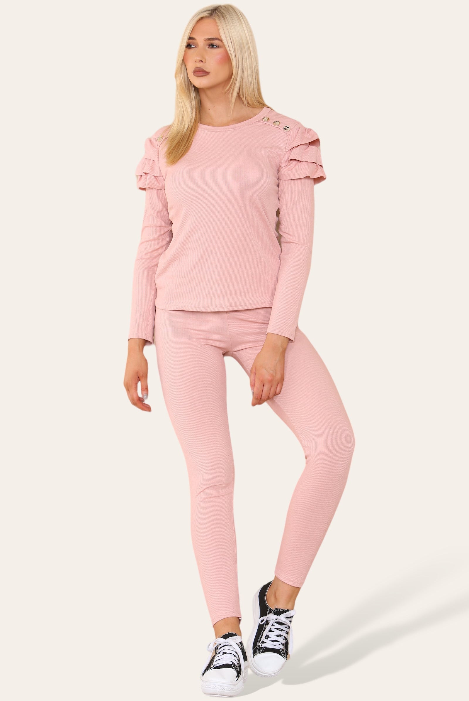 Ruffle Frill Shoulder Ribbed Loungewear CoOrd Top & Trouser Set