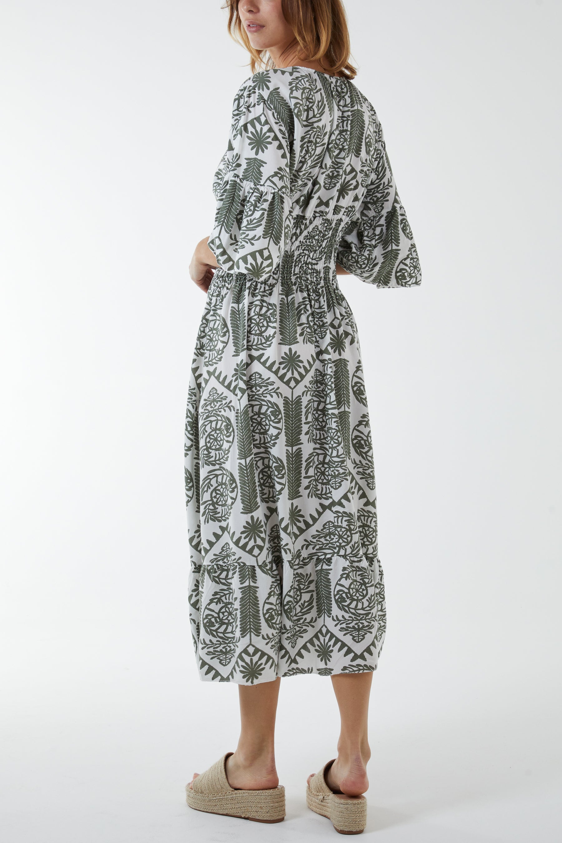 Baroque Floral Shirred Midi Dress
