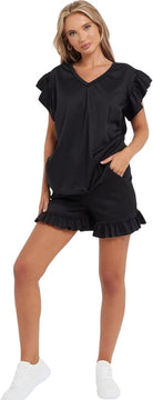 Elevate your summer wardrobe with our stylish and versatile V Neck Frill Peplum Cycling Shorts Co Ord 2 Piece Set. Perfect for a variety of occasions, from casual outings to dressier affairs, this set combines comfort and elegance effortlessly.