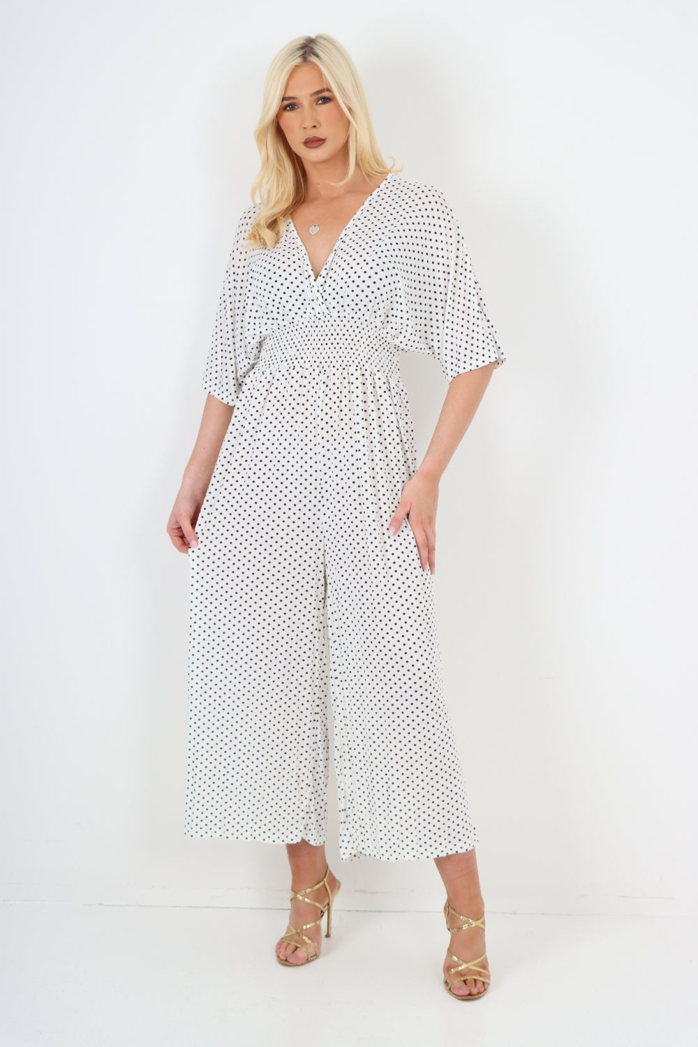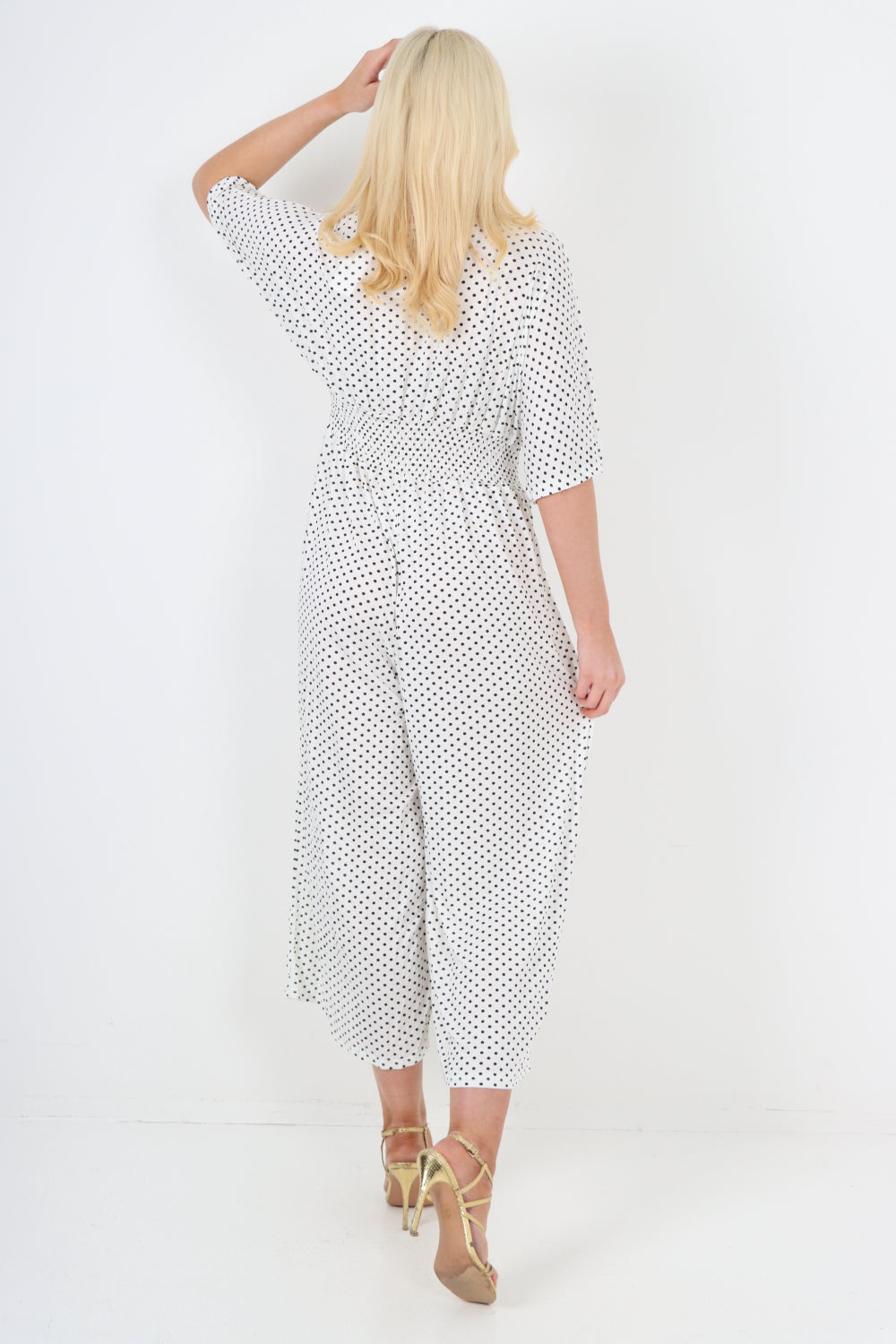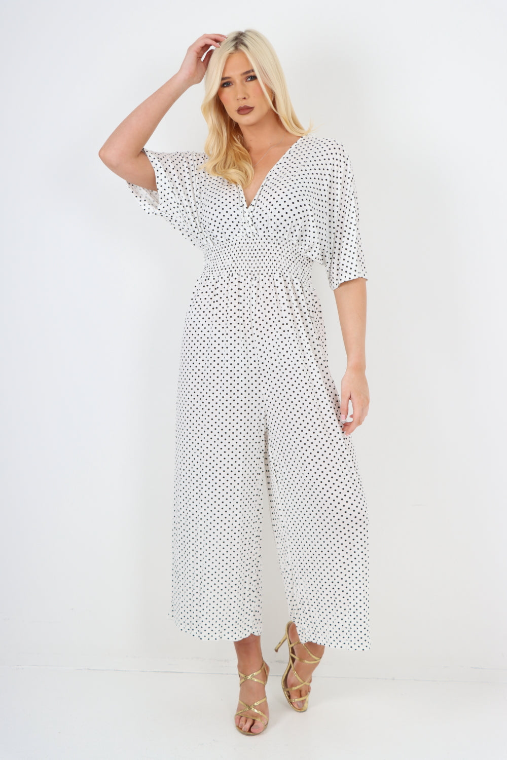 italian polka dot print shirred elasticated waist v neck jumpsuit