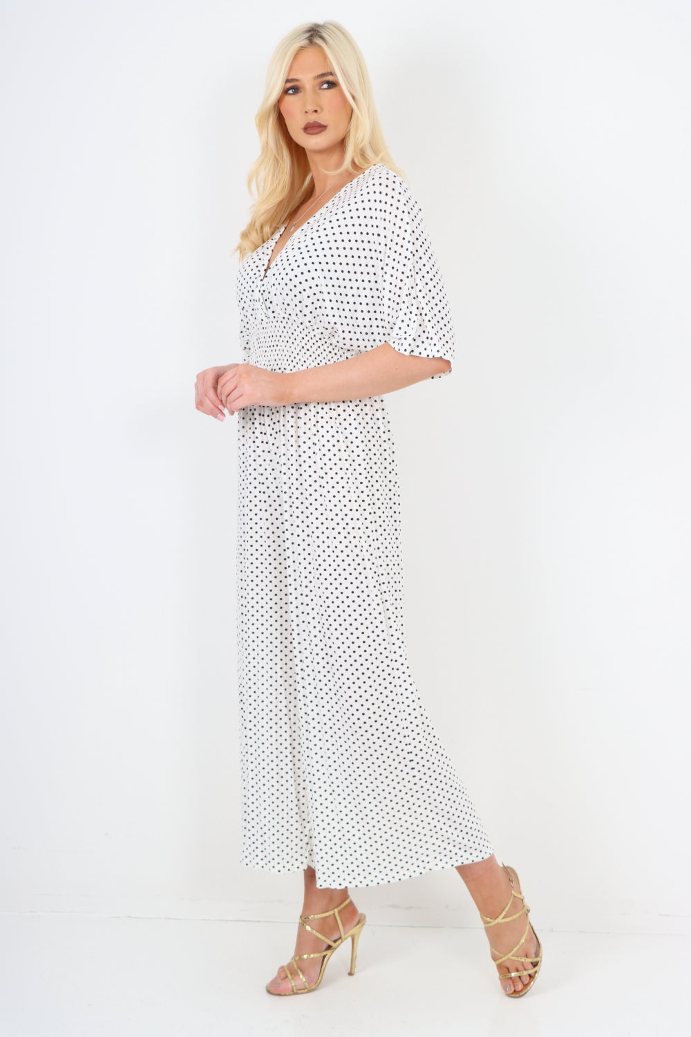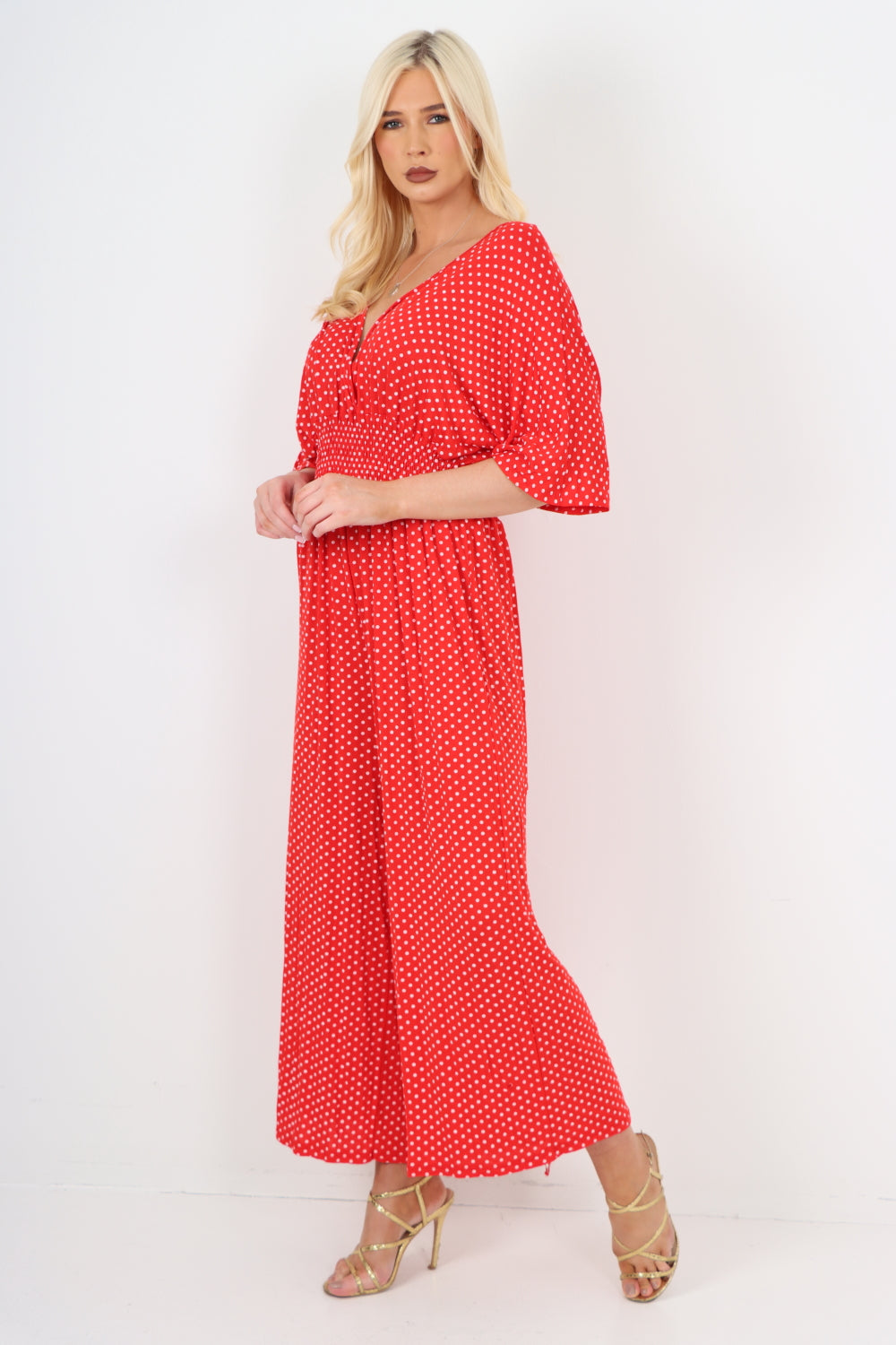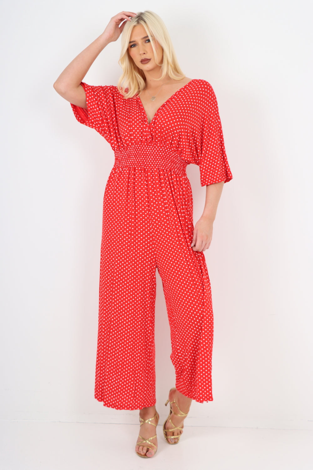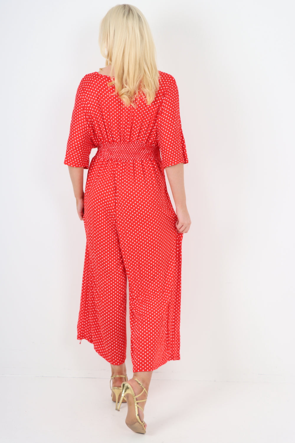 italian polka dot print shirred elasticated waist v neck jumpsuit