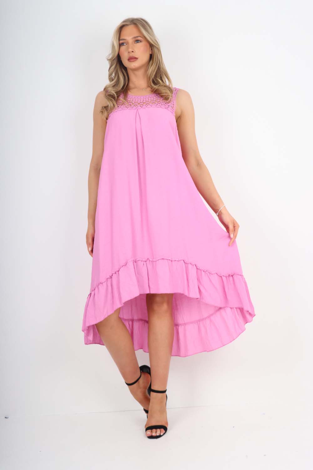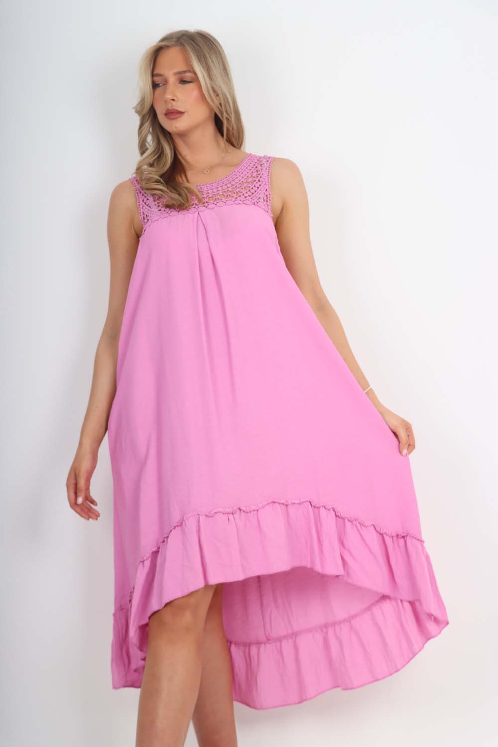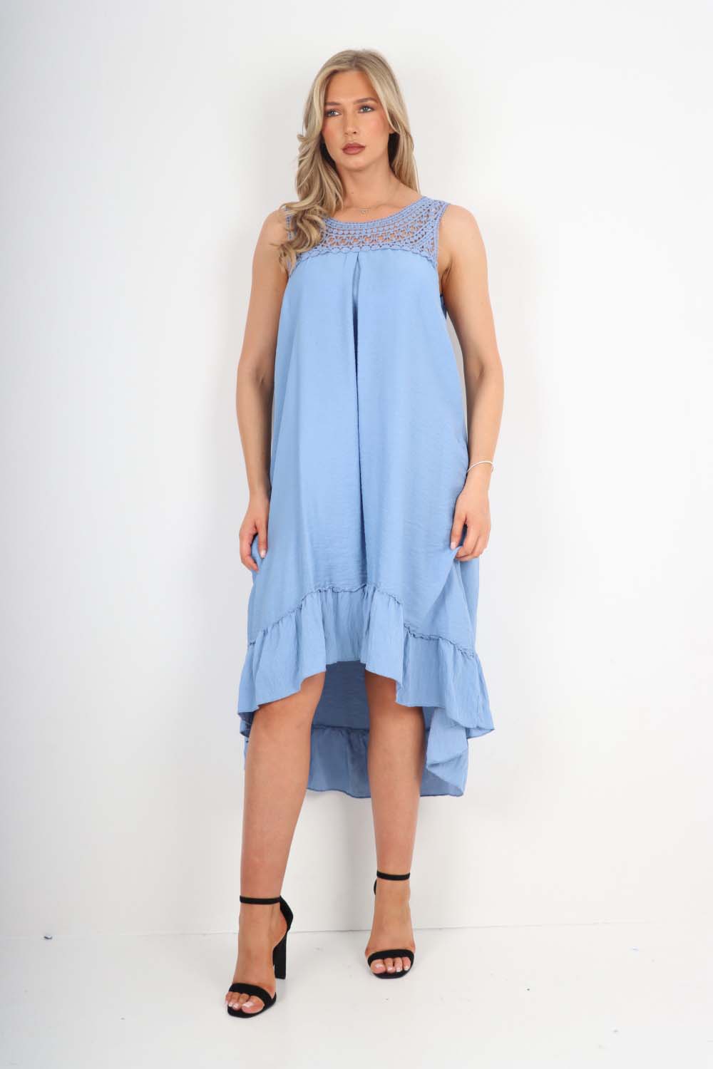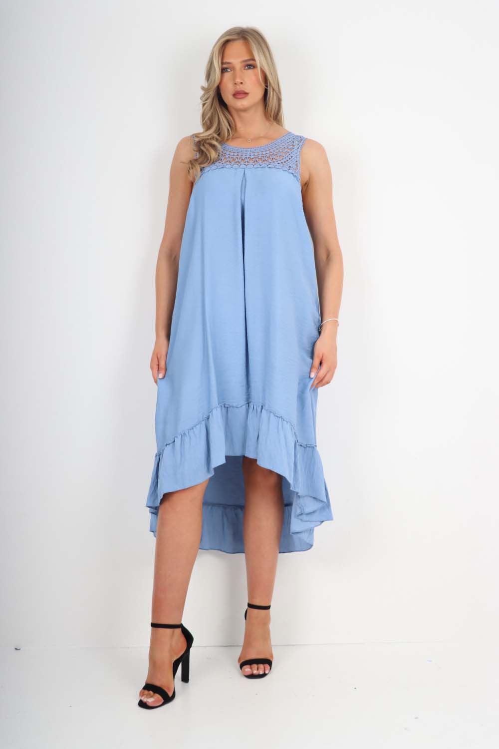 Italian Lace Neckline Dipped Hem Dress