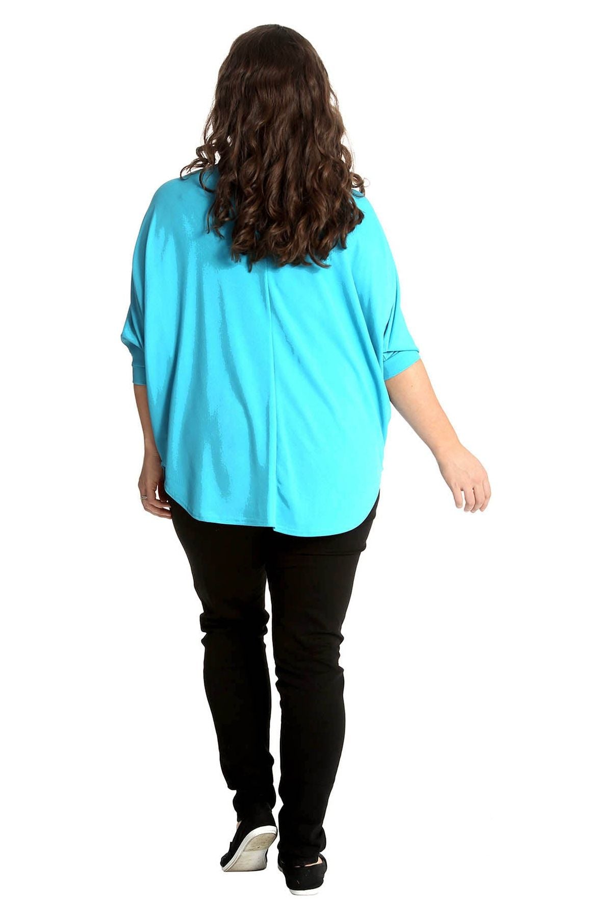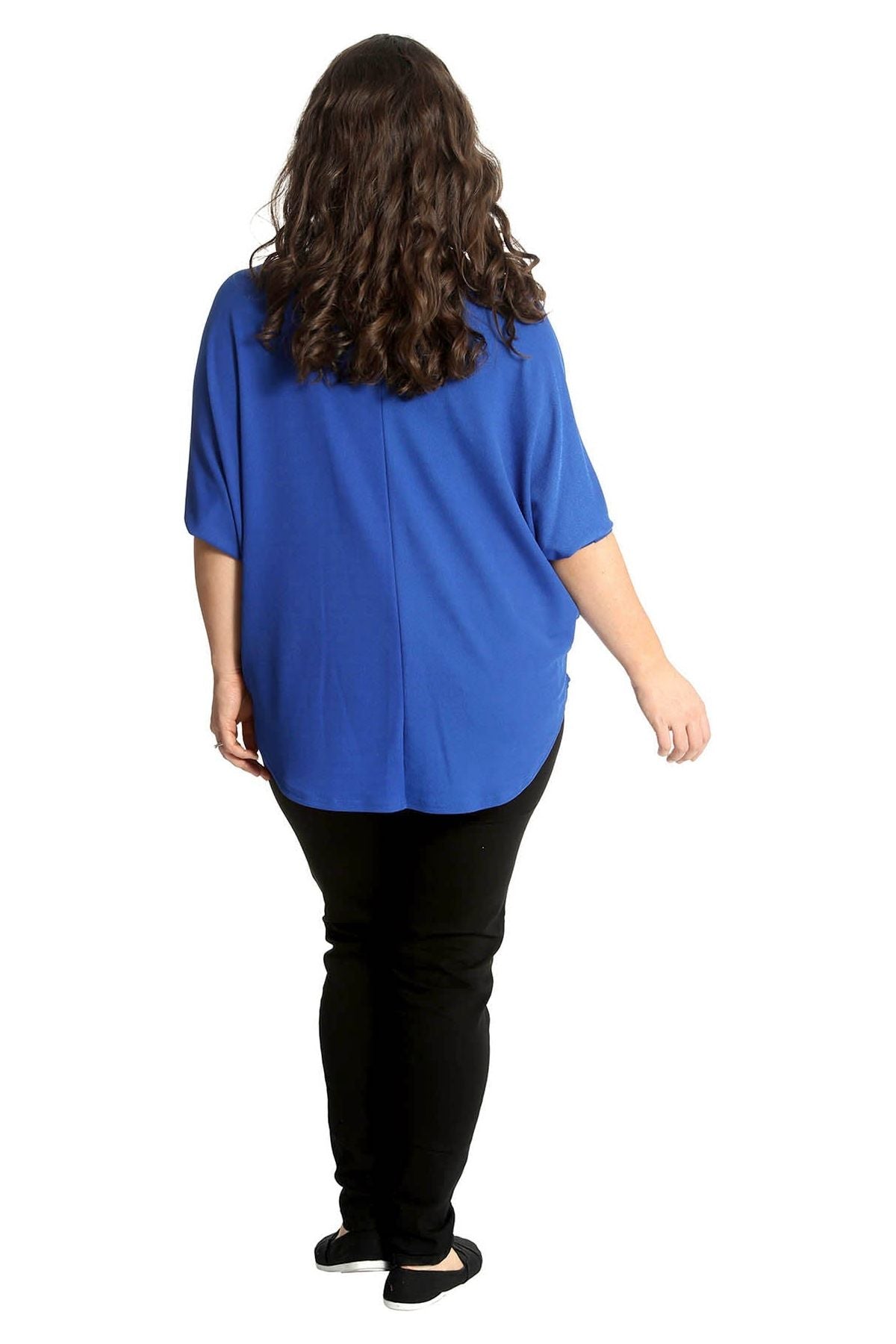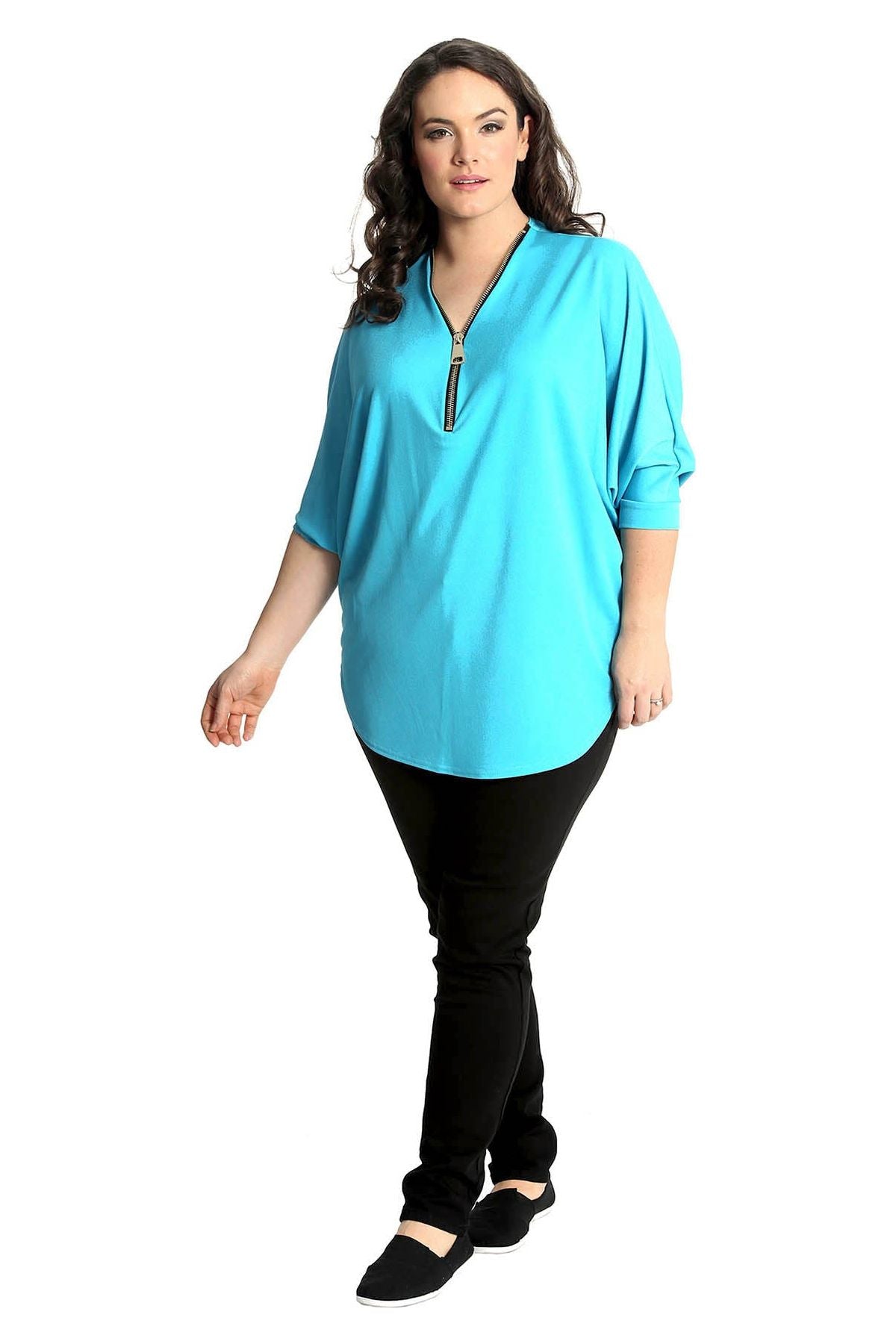 Plus Size Zip Curved Hem V-Neck Batwing Sleeve Top