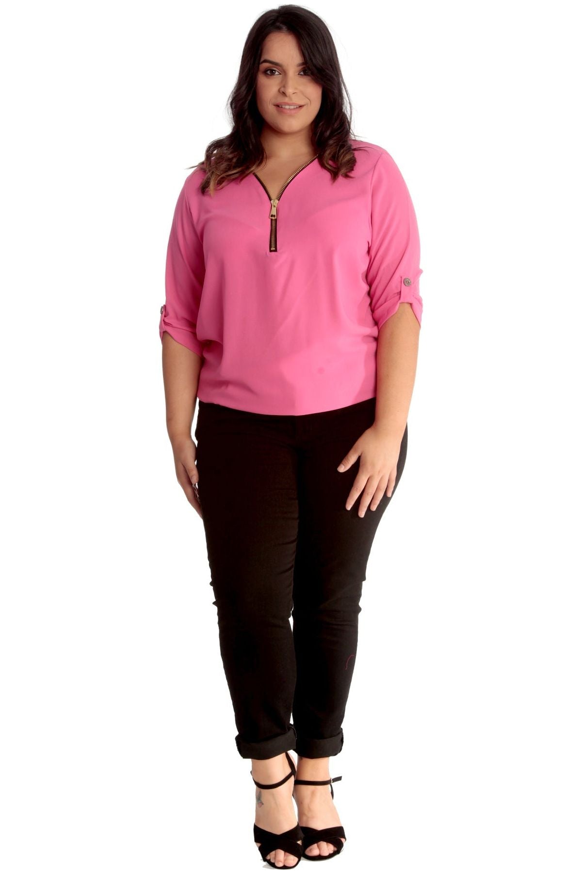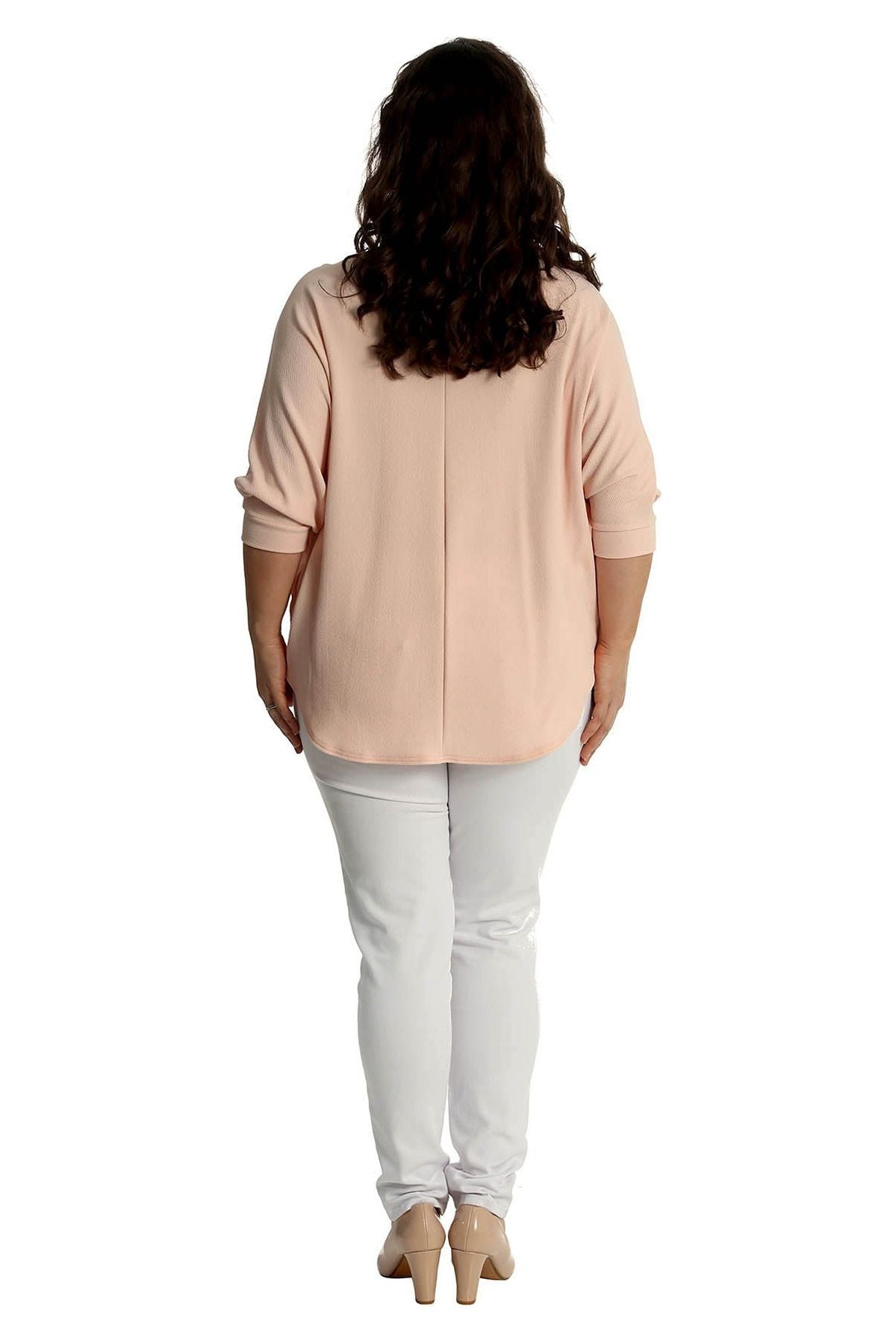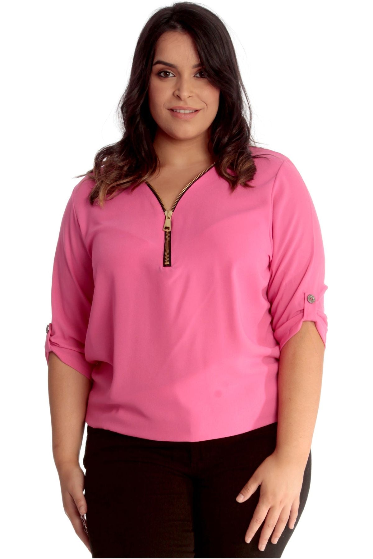 Plus Size Zip Curved Hem V-Neck Batwing Sleeve Top