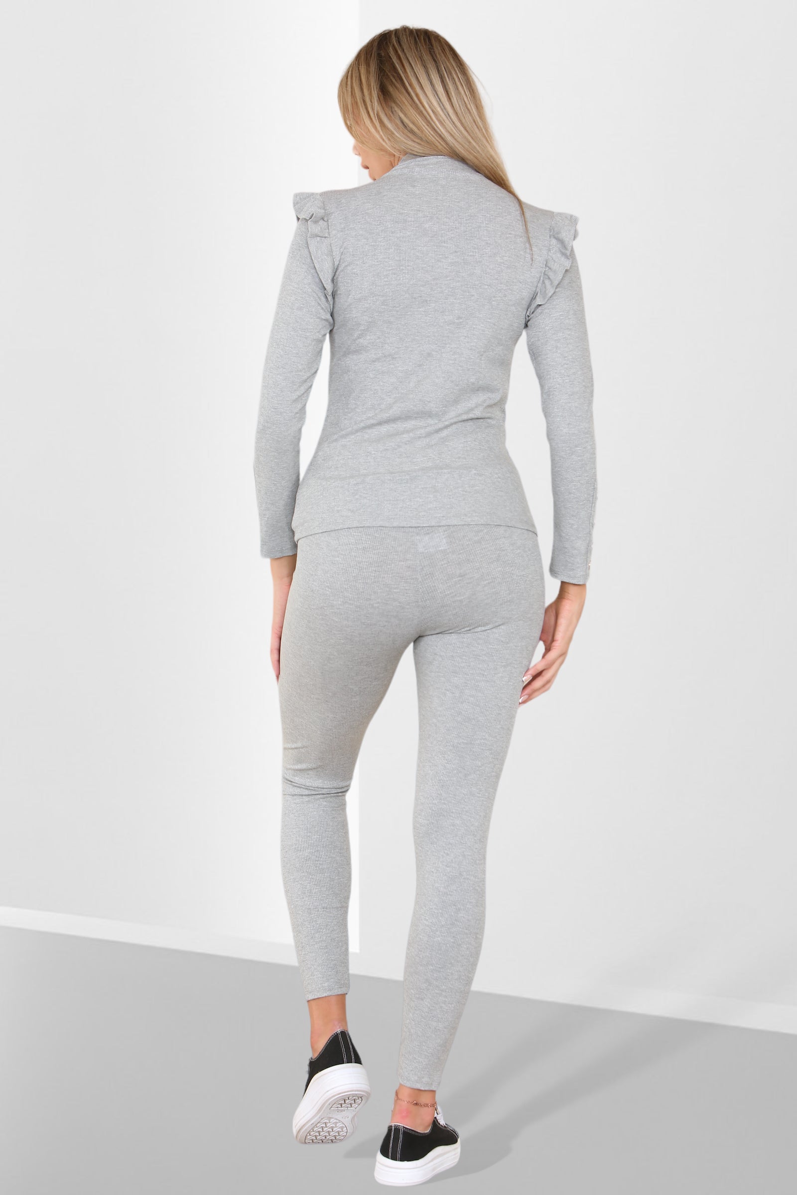 Side Buttons Frill Shoulder Side Neck Gold Button Detail Two Piece Loungewear Set
