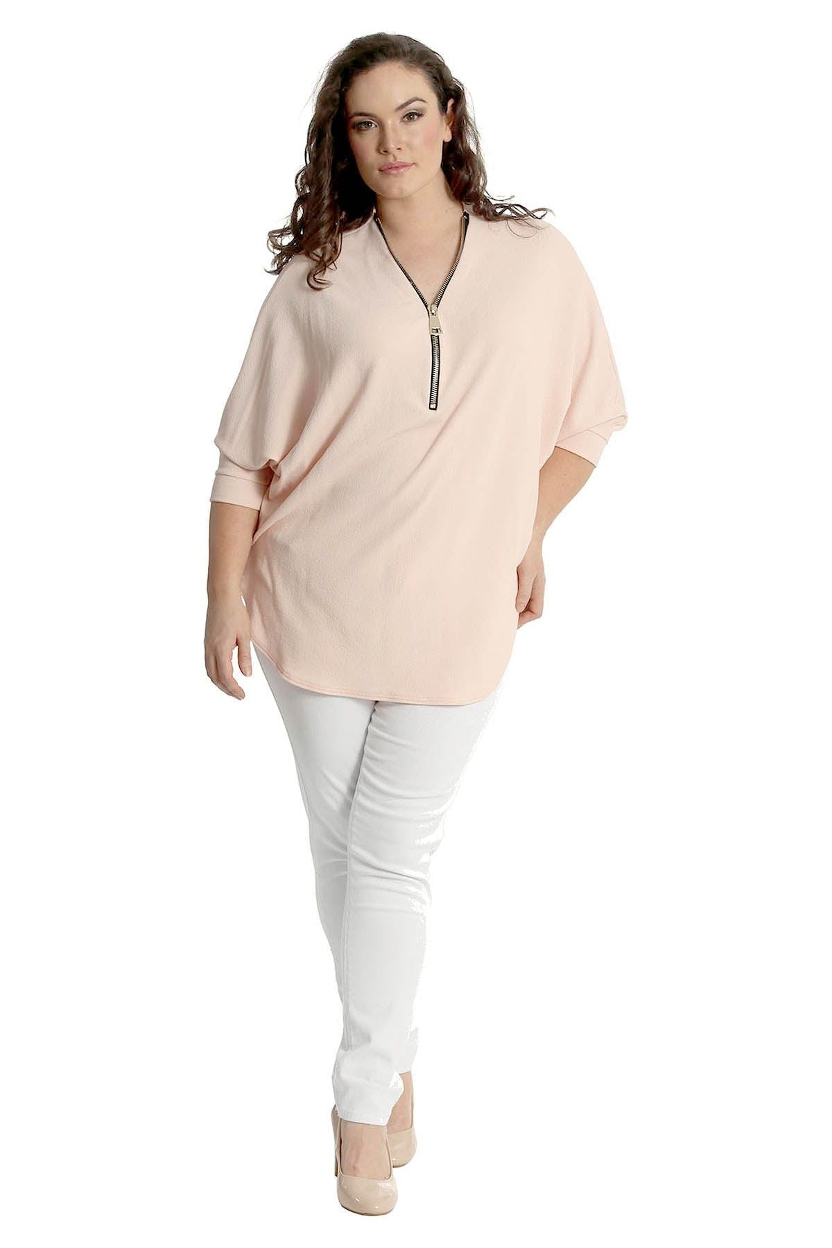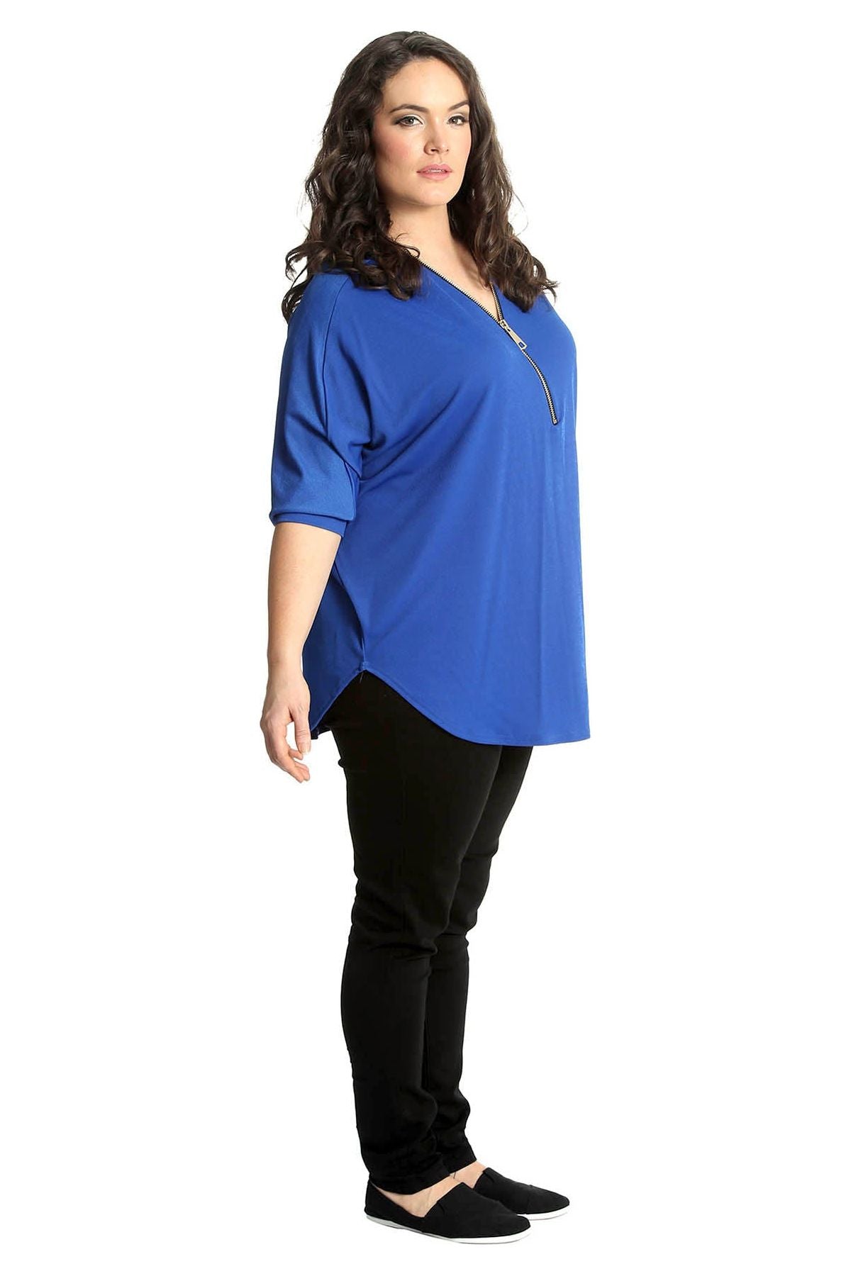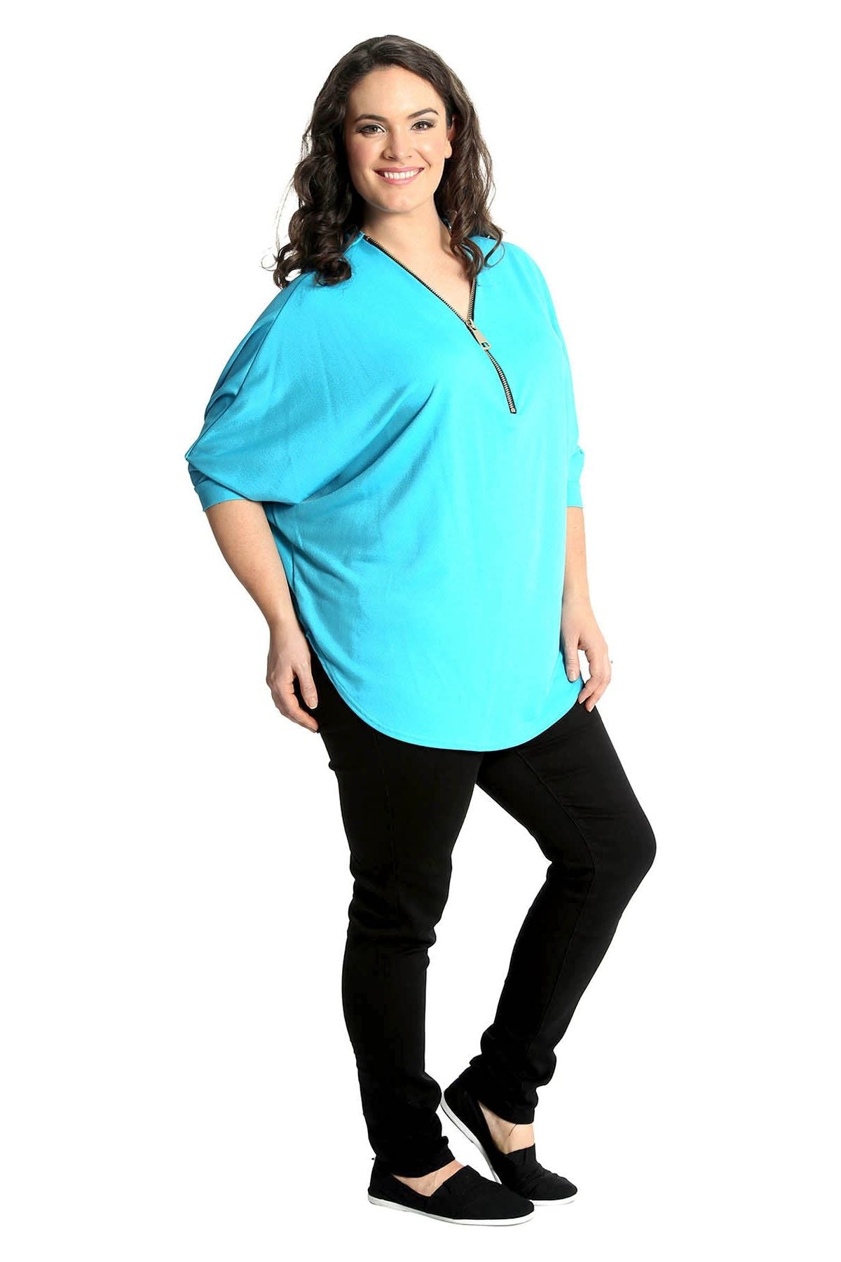 Zip Curved Hem V-Neck Batwing Sleeve Top