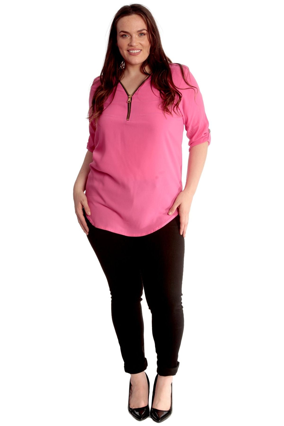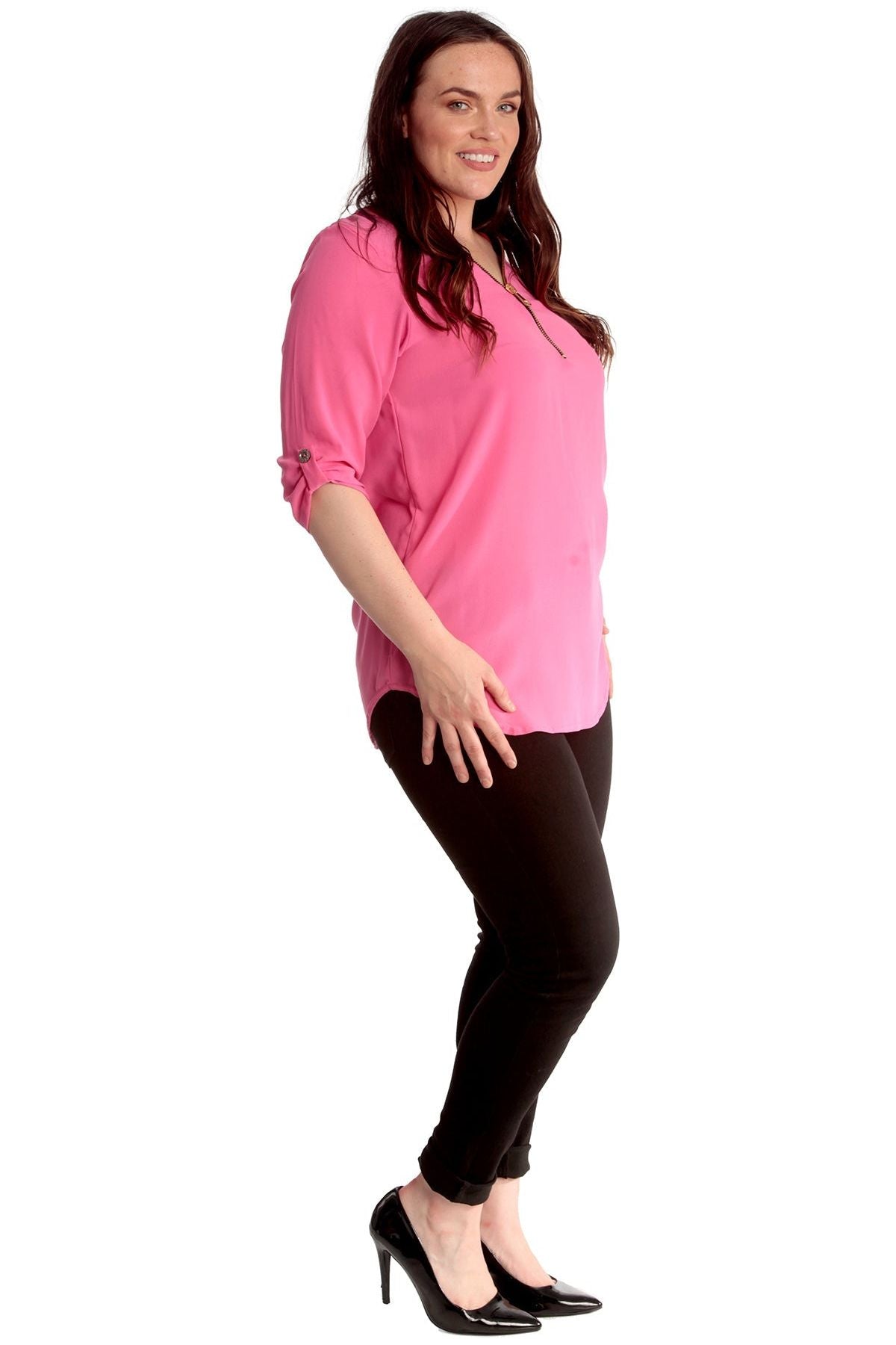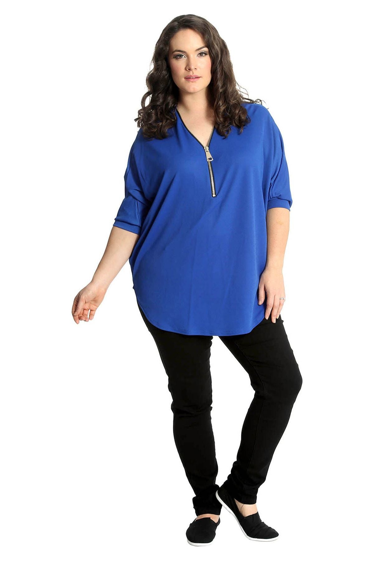 Zip Curved Hem V-Neck Batwing Sleeve Top