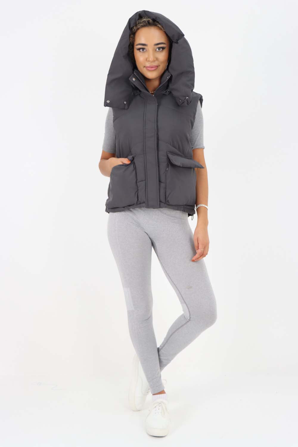 • Women's padded polyester hoodie with quilted pattern and pockets.